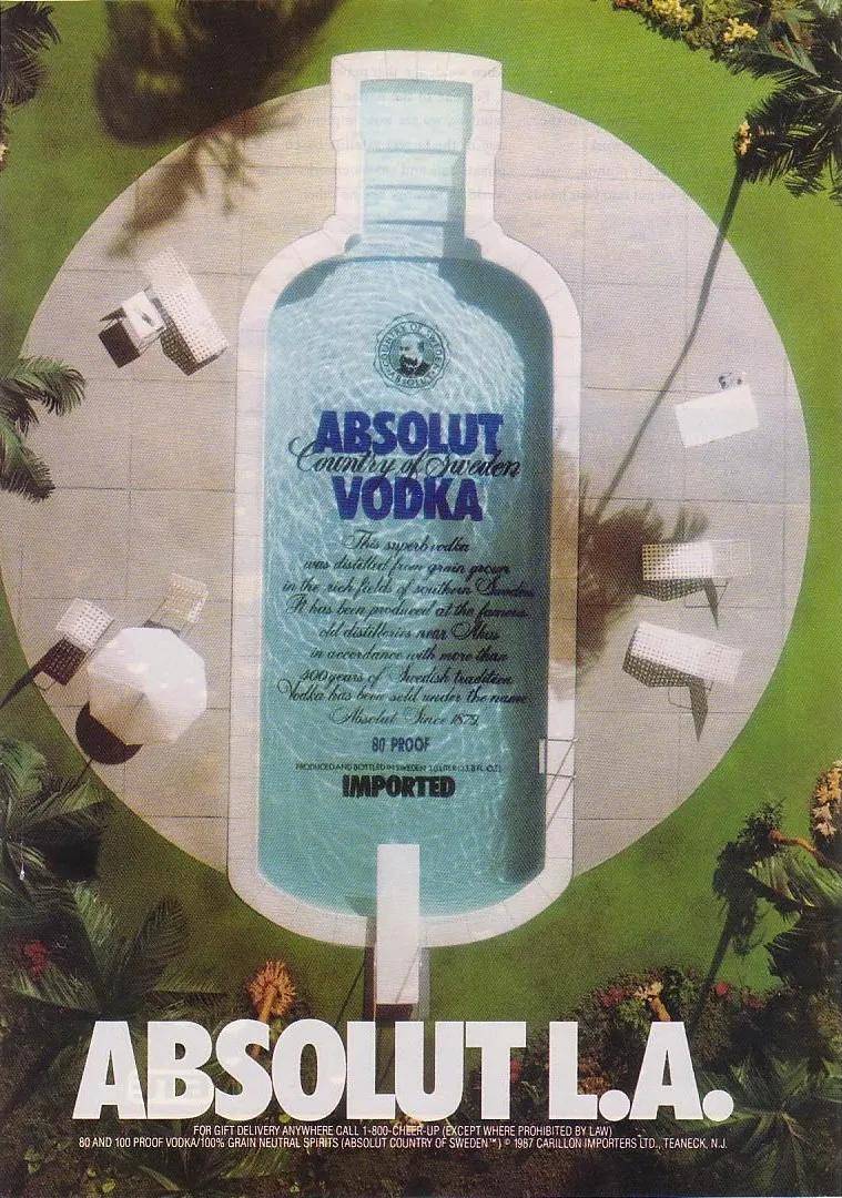 创作人员汤姆麦克马努斯接到任务后,立即联想到了不久前刚看到的安迪沃霍尔的一幅招贴画,于是决定将一个具有加州特色的游泳池做成绝对伏特加酒瓶的形状,放进广告里去。结果,Absolut L.A. 广告推出后,在市场上获得了极大反响。