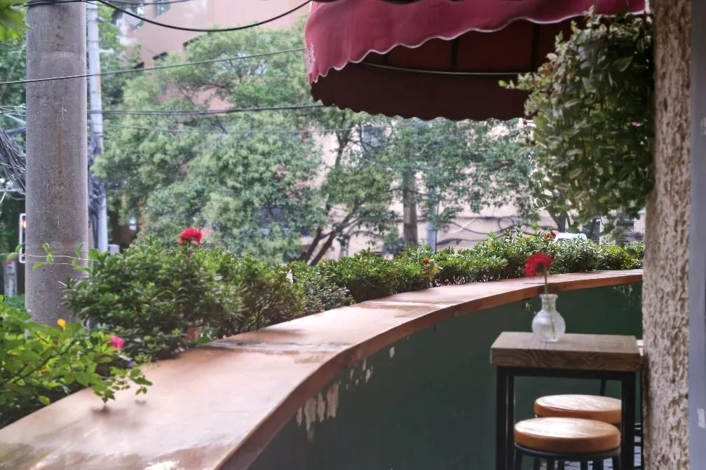 大红格子的落地窗帘隔开的是窗外的繁华。端杯咖啡推门而出,即可在弧形阳台上看楼下的人来人往,路口的车水马龙。这里也是很多网红最喜欢打卡的地方。