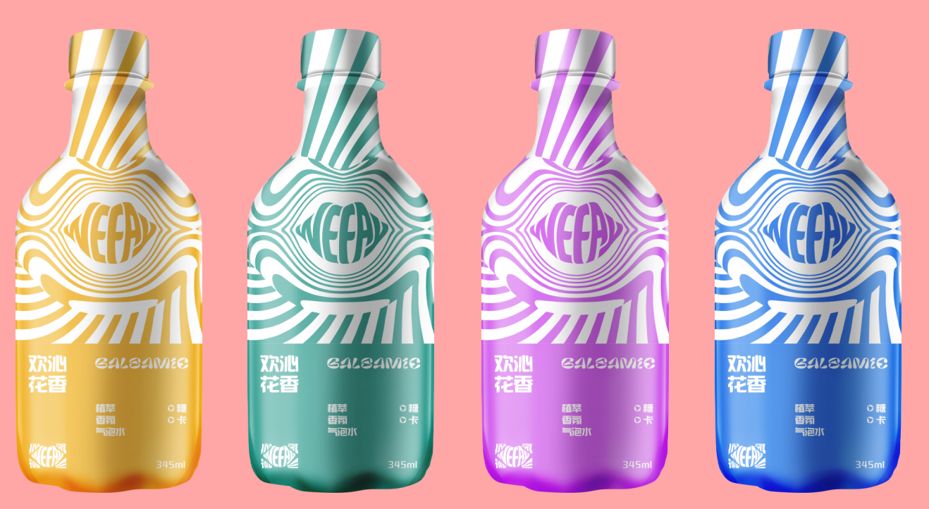 在品牌的视觉中心,是英文名WEFAY组成的“唇印”形状,打造强视觉符号。条纹则是品牌视觉的核心元素,既能给人以弥漫的幻想,也能带来强烈的视觉冲击,条纹弥散开来也象征着饮用微氛后的体验,营造出一种沉浸感。